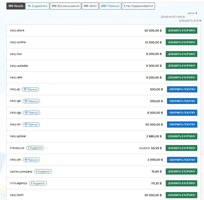зеленым цветом обозначены домены, которые продаются регистратором, синим - которые наши коллеги по цеху выставили как премиум