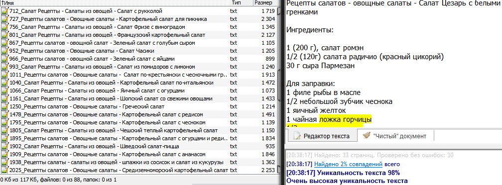 117к символов с пробелами выборочная проверка по адвего 90-98-100% уникальности 88 рецептов выборочно по 1,5$ за кило за все 100$ (менее чем 0,9 за 1к) размер рецептов от 700 до 2900 символов, среднее 1300 можно подготовить файл импорта для тексткита + 15$ ![]() 17_Салат Рецепты - Салаты из овощей - салат из свежих красных помидоров.txt